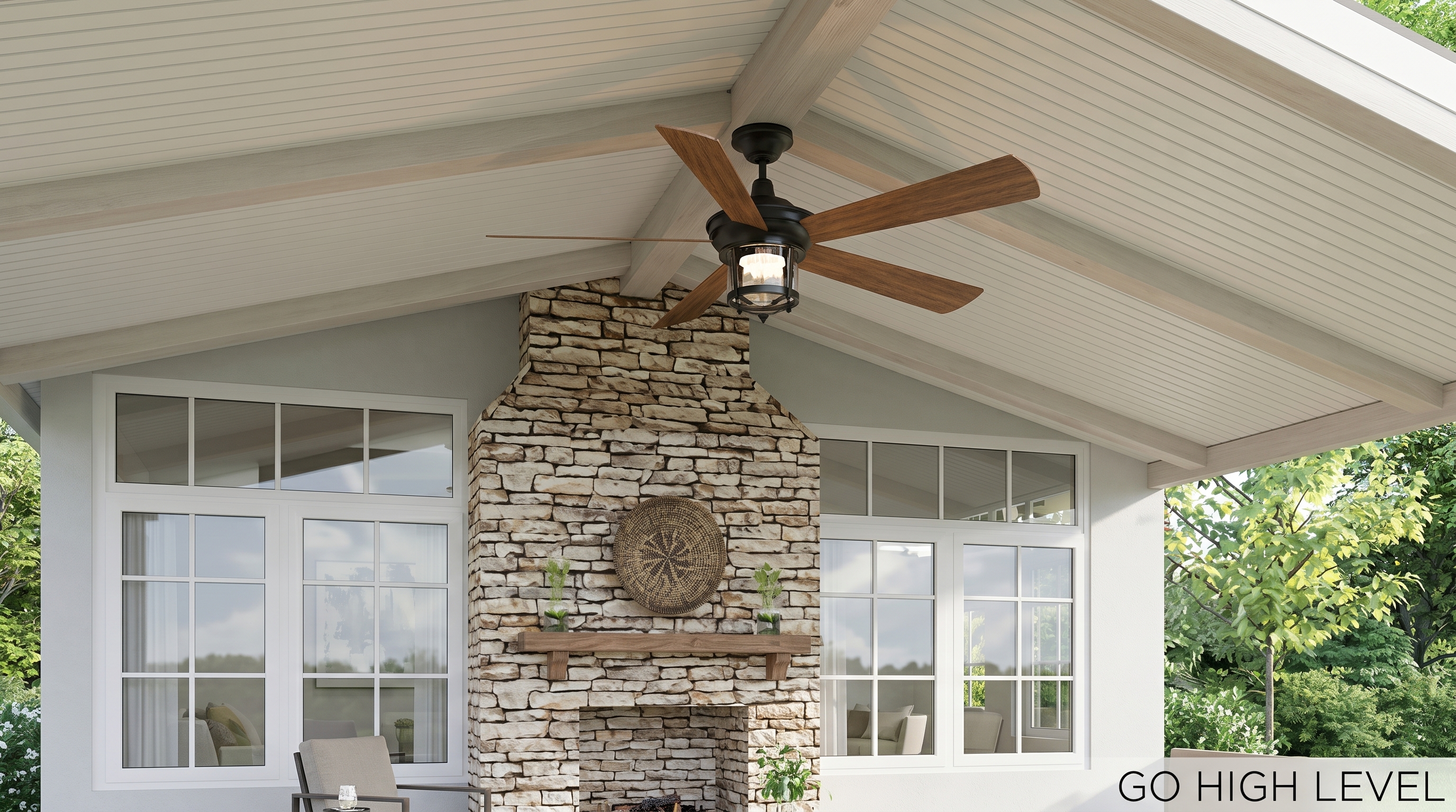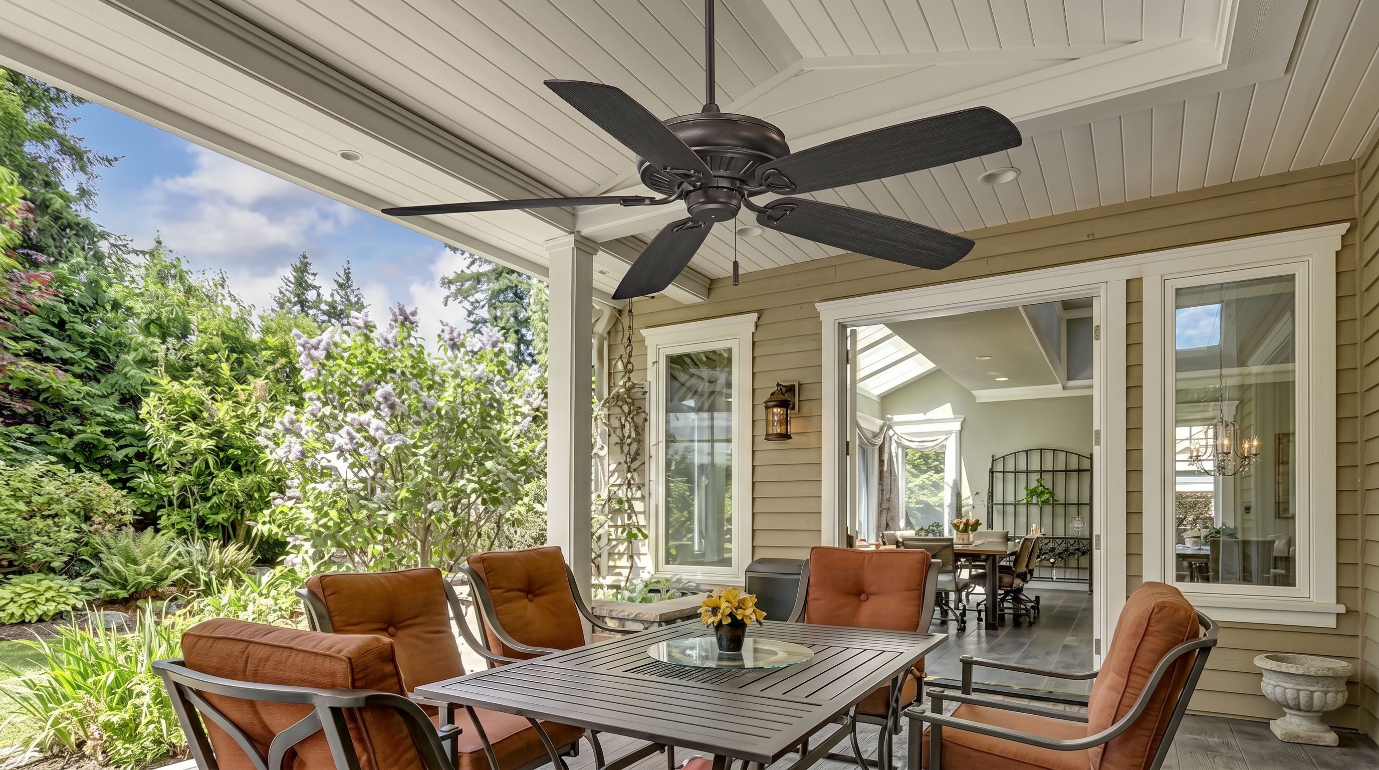 Weather-rated ceiling fans designed for patios, porches, and outdoor living spaces to keep air moving in warmer months.